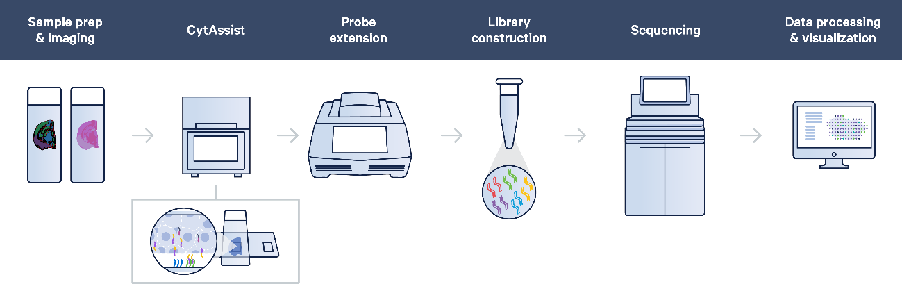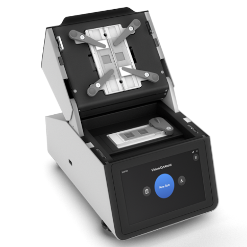 El sistema Visium CytAssist está integrado en el protocolo de procesamiento de transcriptoma espacial en los ensayos de Visium (10X Genomics), que permiten al usuario partir de cortes de tejido, tanto de tejido congelado (tanto fresco como fijado) como en parafina, en portaobjetos standard. El sistema CytAsssist permite transferir de forma sencilla las sondas ya hibridadas al tejido, al slide de Visium, con el que se trabajará hasta su elución y posterior indexado de las librerías para su secuenciación. Más información.